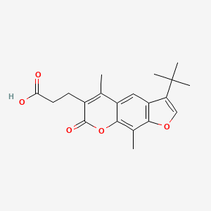 The synthesis of 3-(3-tert-butyl-5,9-dimethyl-7-oxo-7H-furo[3,2-g]chromen-6-yl)propanoic acid typically involves multiple steps, starting from readily available starting materials. The key steps include the formation of the furochromen ring system and the introduction of the propanoic acid side chain. Specific reaction conditions, such as temperature, solvents, and catalysts, are optimized to achieve high yields and purity.
