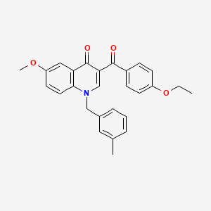 The synthesis of 3-(4-ethoxybenzoyl)-6-methoxy-1-[(3-methylphenyl)methyl]-1,4-dihydroquinolin-4-one typically involves multiple steps, starting from readily available starting materials. One common approach is to use a Friedel-Crafts acylation reaction to introduce the ethoxybenzoyl group onto a suitable aromatic ring. This is followed by a series of functional group transformations, including methoxylation and the formation of the dihydroquinolinone core through cyclization reactions.