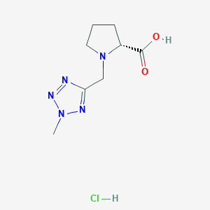 The mechanism of action of ((2-Methyl-2H-tetrazol-5-yl)methyl)-D-proline hydrochloride involves its interaction with specific molecular targets. The tetrazole ring can form hydrogen bonds and coordinate with metal ions, allowing it to modulate the activity of enzymes and receptors. The proline moiety enhances the compound’s binding affinity and specificity for its targets. The overall effect is the modulation of biochemical pathways, leading to changes in cellular functions.