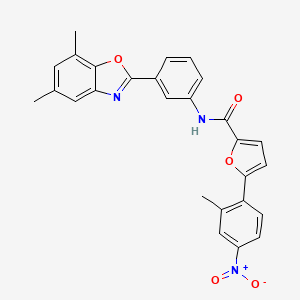 5-(2-Methyl-4-nitrophenyl)-furan-2-carboxylic acid [3-(5,7-dimethylbenzooxazol-2-yl)phenyl]amide is a complex organic compound with potential applications in various scientific fields, particularly in medicinal chemistry and materials science. Its unique structure allows for diverse interactions and functionalities, making it a subject of interest for researchers.