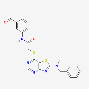 This compound is a structurally complex molecule featuring a thiazolo[4,5-d]pyrimidine core fused with a sulfanyl acetamide moiety and a 3-acetylphenyl substituent. The benzyl(methyl)amino group at position 2 of the thiazolo-pyrimidine ring introduces steric and electronic modifications that may influence its biochemical interactions, such as kinase inhibition or receptor binding.