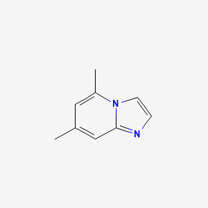 The synthesis of imidazo[1,2-a]pyridine derivatives typically involves condensation reactions between 2-aminoimidazoles and α,β-unsaturated carbonyl compounds or via multicomponent reactions (e.g., Groebke–Blackburn–Bienaymé reaction). For 5,7-dimethyl derivatives, regioselective alkylation at the 5 and 7 positions can be achieved using methylating agents (e.g., methyl iodide) under basic conditions. Key steps include optimizing reaction time, temperature (often 80–120°C), and catalysts (e.g., iodine or Lewis acids) to enhance yield and purity .