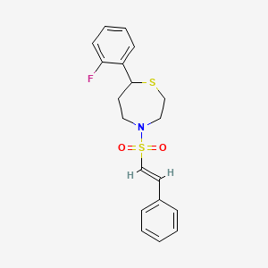 The compound features a thiazepane ring, which is known for its diverse biological activities. The presence of a fluorophenyl group and a styrylsulfonyl moiety is significant for its interaction with biological targets.