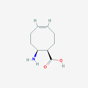 Cis-(Z)-8-Amino-cyclooct-4-enecarboxylic acid is a cyclic amino carboxylic acid characterized by an eight-membered cyclooctene ring with an amino (-NH₂) and a carboxylic acid (-COOH) group in the cis-(Z) configuration. This compound and its hydrochloride derivative (CAS: 350015-75-7) are used in pharmaceutical and biochemical research, particularly in studies involving conformational analysis, peptide mimetics, and ligand design due to their constrained ring structure and zwitterionic properties .