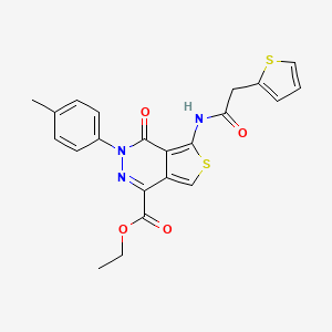 The synthesis of ethyl 3-(4-methylphenyl)-4-oxo-5-[2-(thiophen-2-yl)acetamido]-3H,4H-thieno[3,4-d]pyridazine-1-carboxylate typically involves multi-step organic reactions. The synthetic route often starts with the preparation of the thieno[3,4-d]pyridazine core, followed by the introduction of the thiophene ring and the ethyl ester group. Common reagents used in these reactions include various amines, acyl chlorides, and thiophene derivatives. Industrial production methods may involve optimized reaction conditions to ensure high yield and purity of the final product.