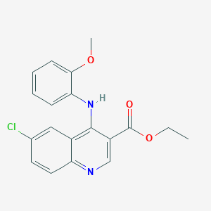 The synthesis of ethyl 6-chloro-4-[(2-methoxyphenyl)amino]quinoline-3-carboxylate typically involves a multi-step process. One common method is the Gould-Jacobs reaction, which is used to synthesize quinoline derivatives. In this method, the starting material, 2-chloroaniline, undergoes a series of reactions including acylation, cyclization, and esterification to form the final product .