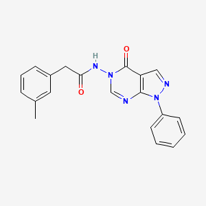 The synthesis of 2-(3-methylphenyl)-N-{4-oxo-1-phenyl-1H,4H,5H-pyrazolo[3,4-d]pyrimidin-5-yl}acetamide typically involves multi-step organic reactions. One common synthetic route starts with the preparation of the pyrazolo[3,4-d]pyrimidine core. This can be achieved by cyclization reactions involving appropriate precursors such as 3-amino-4-cyano-2-thiophenecarboxamides . The reaction conditions often include heating with formic acid or triethyl orthoformate
