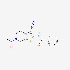 The mechanism of action of N-{6-acetyl-3-cyano-4H,5H,6H,7H-thieno[2,3-c]pyridin-2-yl}-4-methylbenzamide involves its interaction with specific molecular targets. The compound is believed to inhibit certain enzymes or proteins involved in microbial growth and proliferation. The exact molecular pathways and targets are still under investigation, but it is thought to interfere with DNA synthesis or repair mechanisms in microbial cells .
