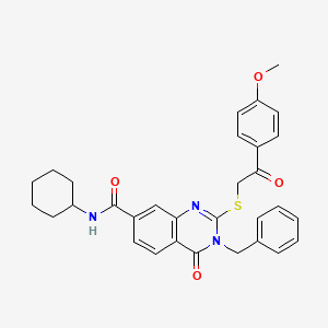 This compound is a quinazoline derivative characterized by a 3,4-dihydroquinazoline core substituted with a benzyl group at position 3, a cyclohexyl carboxamide at position 7, and a sulfanyl-linked 4-methoxyphenyl-2-oxoethyl moiety at position 2. The structural complexity of this molecule confers unique physicochemical and pharmacological properties. Its quinazoline scaffold is known for diverse biological activities, including kinase inhibition and anticancer effects, while the sulfanyl and carboxamide groups enhance solubility and target specificity .