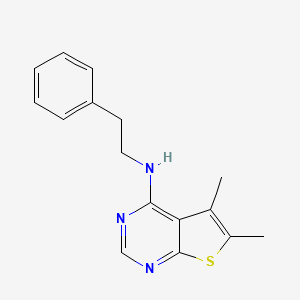 5,6-Dimethyl-N-phenethylthieno[2,3-d]pyrimidin-4-amine (CAS 83548-61-2) is a thienopyrimidine derivative characterized by a bicyclic thieno[2,3-d]pyrimidine core substituted with methyl groups at positions 5 and 6 and a phenethylamine moiety at position 3. Its molecular formula is C₁₆H₁₇N₃S, with a molecular weight of 299.39 g/mol . Thienopyrimidines are pharmacologically significant due to their structural resemblance to purines, enabling interactions with enzymes and receptors involved in nucleotide metabolism and signaling pathways.
