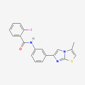 The mechanism of action of 2-iodo-N-(3-(3-methylimidazo[2,1-b]thiazol-6-yl)phenyl)benzamide involves its interaction with specific molecular targets, such as enzymes or receptors. The imidazo[2,1-b]thiazole moiety is known to interact with various biological targets, potentially inhibiting enzyme activity or modulating receptor function. The iodine atom may also play a role in enhancing the compound’s binding affinity through halogen bonding interactions.