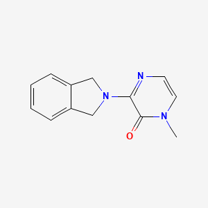 3-(Isoindolin-2-yl)-1-methylpyrazin-2(1H)-one combines two pharmacologically relevant heterocycles: isoindoline and pyrazinone. The isoindolin-2-yl group introduces a bicyclic benzannulated amine, while the 1-methylpyrazin-2(1H)-one moiety contributes a diazine ring with a ketone functionality. The synthetic complexity arises from (i) regioselective introduction of the methyl group at the pyrazinone’s N1 position and (ii) establishing a stable C3–N bond between the isoindoline and pyrazinone systems.