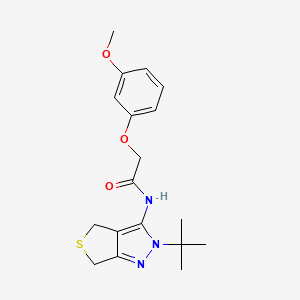 The synthesis of N-{2-tert-butyl-2H,4H,6H-thieno[3,4-c]pyrazol-3-yl}-2-(3-methoxyphenoxy)acetamide typically involves multi-step organic reactions. The starting materials may include thienopyrazole derivatives and phenoxyacetic acid derivatives. Common synthetic routes may involve: