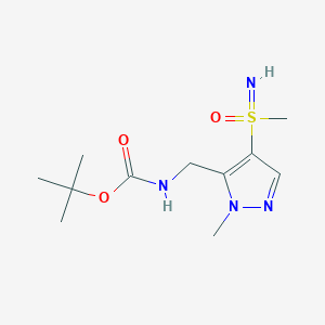This compound belongs to the class of tert-butyl carbamate derivatives, which are widely used in medicinal and organic chemistry as intermediates for drug discovery. Its structure features a pyrazole core substituted with a methylsulfonimidoyl group at the 4-position and a tert-butyl carbamate-protected aminomethyl group at the 3-position.
