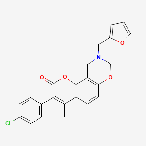 3-(4-Chlorophenyl)-9-(furan-2-ylmethyl)-4-methyl-9,10-dihydrochromeno[8,7-e][1,3]oxazin-2(8H)-one is a chromeno-oxazine derivative characterized by a fused tricyclic scaffold. The core structure consists of a chromene ring fused to an oxazine moiety, substituted at the 3-position with a 4-chlorophenyl group, at the 9-position with a furan-2-ylmethyl side chain, and at the 4-position with a methyl group.