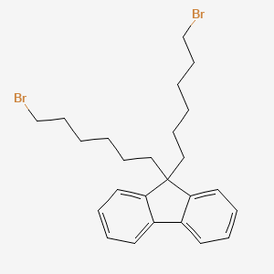 9,9-Bis(6-bromohexyl)fluorene is a substituted fluorene derivative that serves as a key building block in the synthesis of advanced organic materials. Its unique structure, featuring a rigid and planar fluorene core functionalized with two flexible bromohexyl side chains, imparts desirable properties for applications in organic electronics, optoelectronics, and polymer chemistry. The terminal bromine atoms on the hexyl chains provide reactive sites for a variety of chemical modifications, making it a versatile precursor for the development of functional polymers and novel molecular architectures. This guide provides a comprehensive overview of the chemical properties, synthesis, and reactivity of this compound.