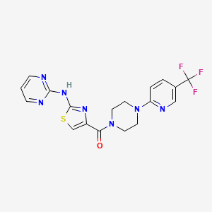 This compound features a thiazole core substituted at the 2-position with a pyrimidin-2-amine group and at the 4-position with a piperazine-1-carbonyl linker attached to a 5-(trifluoromethyl)pyridin-2-yl moiety. The trifluoromethyl group enhances lipophilicity and metabolic stability, while the piperazine and pyridine components contribute to target binding via hydrogen bonding and π-π interactions. This structural architecture is common in kinase inhibitors, particularly cyclin-dependent kinase 4/6 (CDK4/6) inhibitors, as evidenced by related compounds in the literature .