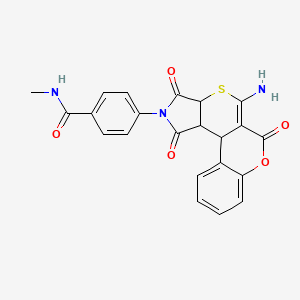 The synthesis of 4-(11-amino-9,14,16-trioxo-8-oxa-12-thia-15-azatetracyclo[8.7.0.02,7.013,17]heptadeca-2,4,6,10-tetraen-15-yl)-N-methylbenzamide involves multiple steps, each requiring specific reaction conditions. The synthetic route typically starts with the preparation of the core tetracyclic structure, followed by the introduction of the amino and oxo groups. Industrial production methods may involve the use of high-pressure reactors and specialized catalysts to ensure high yield and purity.