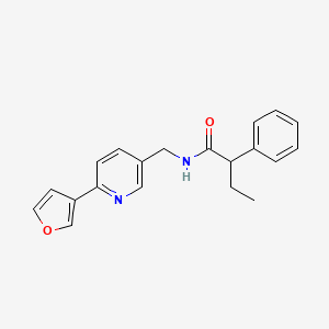 N-((6-(Furan-3-yl)pyridin-3-yl)methyl)-2-phenylbutanamide is a structurally complex organic compound featuring a pyridine core substituted at position 6 with a furan-3-yl group and at position 3 with a methyl-linked amide moiety. Key features include: