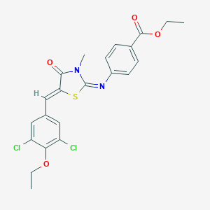 InChI=1S/C22H20Cl2N2O4S/c1-4-29-19-16(23)10-13(11-17(19)24)12-18-20(27)26(3)22(31-18)25-15-8-6-14(7-9-15)21(28)30-5-2/h6-12H,4-5H2,1-3H3/b18-12-,25-22? |