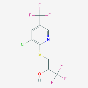 The mechanism of action of 3-{[3-Chloro-5-(trifluoromethyl)-2-pyridinyl]sulfanyl}-1,1,1-trifluoro-2-propanol involves its interaction with specific molecular targets and pathways. The compound’s unique structure allows it to bind to certain enzymes or receptors, potentially inhibiting or activating their functions. This interaction can lead to various biological effects, depending on the target and the context of its use .