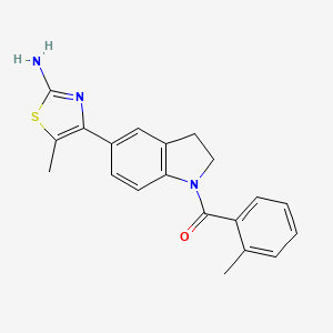 The synthesis of (5-(2-Amino-5-methylthiazol-4-yl)indolin-1-yl)(o-tolyl)methanone involves multiple steps, typically starting with the preparation of the indolin-1-yl and thiazolyl intermediates. The reaction conditions often include the use of solvents like dimethylformamide (DMF) and catalysts such as palladium on carbon (Pd/C). The final step involves the coupling of the indolin-1-yl and thiazolyl intermediates with the tolyl group under controlled temperature and pressure conditions .