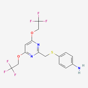 4-[4,6-Bis(2,2,2-trifluoroethoxy)pyrimidin-2-yl)methylthio]aniline is a complex organic compound characterized by its unique trifluoroethoxy and pyrimidine functionalities. This compound has garnered interest in medicinal chemistry due to its potential biological activities, particularly in cancer treatment and enzyme inhibition.