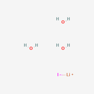 Lithium iodide, particularly in its hydrated form, serves as a vital precursor and active material in numerous advanced technologies. Its high ionic conductivity makes it a valuable component in electrolytes for high-temperature and long-life batteries, including those used in pacemakers[1][2]. In the realm of organic chemistry, it is employed as a catalyst for cleaving C-O bonds, a fundamental transformation in various synthetic pathways[1]. Furthermore, its role as a raw material in the pharmaceutical and photographic industries highlights its versatility[3][4][5]. The trihydrate is the common, stable form of lithium iodide under ambient conditions, making its synthesis and characterization a foundational aspect of research and development in these fields.