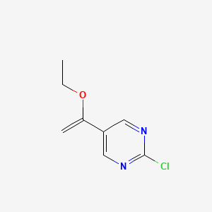 The pyrimidine ring in 2-Chloro-5-(1-ethoxyvinyl)pyrimidine is electron-deficient, which significantly influences its reactivity. This deficiency facilitates nucleophilic substitution reactions, particularly at the C-2 position, while also allowing for functionalization at other positions on the ring.