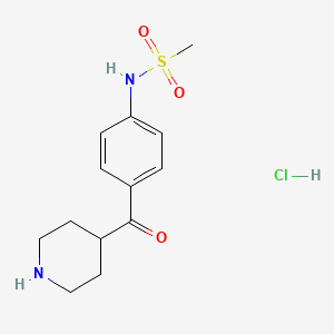N-[4-(Piperidine-4-carbonyl)-phenyl]methanesulfonamide hydrochloride is a synthetic small-molecule compound characterized by a piperidine-4-carbonyl group attached to a phenyl ring, which is further substituted with a methanesulfonamide moiety. The hydrochloride salt enhances its solubility in aqueous environments, making it suitable for pharmacological studies.