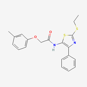 This compound features a thiazole core substituted at the 2-position with an ethylthio (-S-C₂H₅) group and at the 4-position with a phenyl ring. The acetamide moiety is attached to the 5-position of the thiazole, with the side chain containing a 2-(m-tolyloxy) group (a methyl-substituted phenoxy group at the meta position).