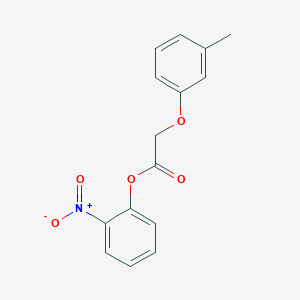 2-Nitrophenyl (3-methylphenoxy)acetate is an ester derivative characterized by a nitro group at the ortho position of the phenyl ring and a 3-methylphenoxy moiety attached to the acetate backbone. Its molecular formula is C₁₅H₁₃NO₅, with a molecular weight of 287.27 g/mol. The nitro group enhances the compound’s electrophilicity, making it reactive in hydrolysis and aminolysis reactions, while the 3-methylphenoxy group introduces steric and electronic effects that modulate its interactions in biological or chemical systems .