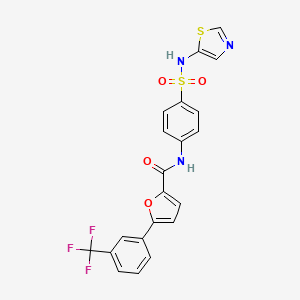 The mechanism of action of N-[4-(1,3-thiazol-5-ylsulfamoyl)phenyl]-5-[3-(trifluoromethyl)phenyl]furan-2-carboxamide involves its interaction with specific molecular targets. The thiazole and sulfonamide groups are known to interact with enzymes and receptors, potentially inhibiting their activity. This interaction can disrupt various biological pathways, leading to the compound’s observed effects. The exact molecular targets and pathways involved are subjects of ongoing research.