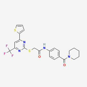 N-[4-(PIPERIDINE-1-CARBONYL)PHENYL]-2-{[4-(THIOPHEN-2-YL)-6-(TRIFLUOROMETHYL)PYRIMIDIN-2-YL]SULFANYL}ACETAMIDE is a complex organic compound that features a combination of piperidine, phenyl, thiophene, and pyrimidine moieties
