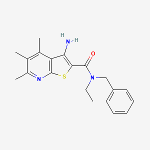 3-amino-N-benzyl-N-ethyl-4,5,6-trimethylthieno[2,3-b]pyridine-2-carboxamide is a complex organic compound that belongs to the class of thienopyridines. This compound is characterized by its unique structure, which includes a thieno[2,3-b]pyridine core substituted with amino, benzyl, ethyl, and trimethyl groups. The presence of these functional groups imparts specific chemical and physical properties to the compound, making it of interest in various fields of scientific research.
