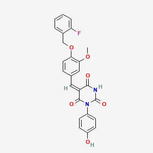 The exact mass of the compound 5-{4-[(2-fluorobenzyl)oxy]-3-methoxybenzylidene}-1-(4-hydroxyphenyl)-2,4,6(1H,3H,5H)-pyrimidinetrione is 462.12271449 g/mol and the complexity rating of the compound is 796. The storage condition is unknown. Please store according to label instructions upon receipt of goods.