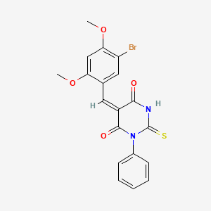 (5E)-5-[(5-bromo-2,4-dimethoxyphenyl)methylidene]-1-phenyl-2-sulfanylidene-1,3-diazinane-4,6-dione is a complex organic compound with potential applications in various fields of scientific research. This compound features a unique structure that includes a brominated aromatic ring, methoxy groups, and a diazinane-4,6-dione core, making it an interesting subject for chemical studies.