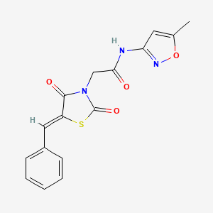 This compound features a 1,3-thiazolidin-2,4-dione core substituted at position 5 with a benzylidene group and an acetamide side chain linked to a 5-methylisoxazole moiety. The thiazolidinone scaffold is pharmacologically significant, often associated with antimicrobial, anticancer, and anti-inflammatory activities . The benzylidene group enhances π-π stacking interactions with biological targets, while the 5-methylisoxazole improves metabolic stability compared to bulkier heterocycles .
