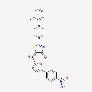 InChI=1S/C25H22N4O4S/c1-17-4-2-3-5-21(17)27-12-14-28(15-13-27)25-26-24(30)23(34-25)16-20-10-11-22(33-20)18-6-8-19(9-7-18)29(31)32/h2-11,16H,12-15H2,1H3/b23-16+ | |