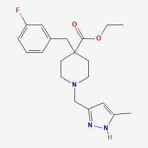 Ethyl 4-[(3-fluorophenyl)methyl]-1-[(5-methyl-1H-pyrazol-3-yl)methyl]piperidine-4-carboxylate is a complex organic compound that belongs to the class of piperidine derivatives. This compound is characterized by the presence of a piperidine ring, a fluorophenyl group, and a pyrazolylmethyl group. It is of interest in various fields of scientific research due to its unique structural features and potential biological activities.
