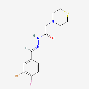 The mechanism of action of N-[(E)-(3-bromo-4-fluorophenyl)methylideneamino]-2-thiomorpholin-4-ylacetamide involves its interaction with biological molecules. The compound can form coordination complexes with metal ions, which can inhibit the activity of certain enzymes. Additionally, its ability to interact with nucleic acids and proteins makes it a potential candidate for therapeutic applications. The exact molecular targets and pathways involved depend on the specific biological context in which the compound is used.