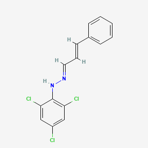 The mechanism of action of 2,4,6-trichloro-N-[(E)-[(E)-3-phenylprop-2-enylidene]amino]aniline involves its interaction with molecular targets, such as enzymes and receptors. The compound can form covalent bonds with nucleophilic sites on proteins, leading to inhibition or activation of enzymatic activity. The specific pathways involved depend on the biological context and the nature of the target molecules .