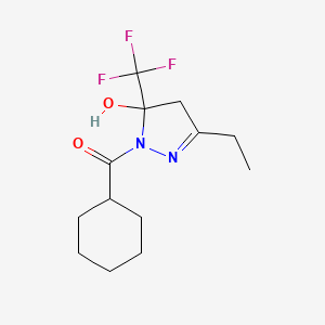 The mechanism of action of cyclohexyl-[3-ethyl-5-hydroxy-5-(trifluoromethyl)-4H-pyrazol-1-yl]methanone involves its interaction with specific molecular targets and pathways. The compound can bind to enzymes or receptors, modulating their activity and leading to various biological effects. The trifluoromethyl group is known to enhance the compound’s lipophilicity, improving its ability to cross cell membranes and reach its targets.