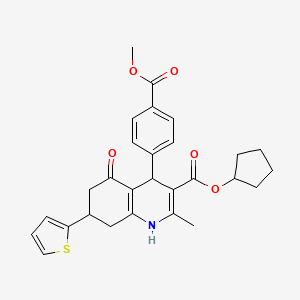 Cyclopentyl 4-[4-(methoxycarbonyl)phenyl]-2-methyl-5-oxo-7-(thiophen-2-yl)-1,4,5,6,7,8-hexahydroquinoline-3-carboxylate is a complex organic compound that belongs to the class of hexahydroquinolines. This compound is characterized by its unique structure, which includes a cyclopentyl group, a methoxycarbonyl phenyl group, a thiophenyl group, and a hexahydroquinoline core. It is of interest in various fields of scientific research due to its potential biological activities and applications in medicinal chemistry.