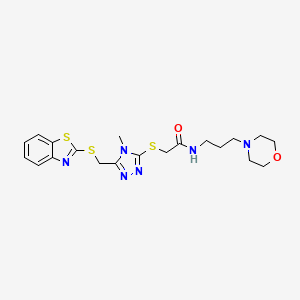 The synthesis of 2-[5-(Benzothiazol-2-ylsulfanylmethyl)-4-methyl-4H-[1,2,4]triazol-3-ylsulfanyl]-N-(3-morpholin-4-yl-propyl)-acetamide typically involves multi-step organic reactions. The process begins with the formation of the benzothiazole moiety, which is then linked to a triazole ring through a sulfanylmethyl group. The triazole ring is further functionalized with a methyl group at the 4-position. The final step involves the attachment of the morpholine group via an acetamide linkage. The reaction conditions often include the use of solvents like dichloromethane or dimethylformamide, catalysts such as triethylamine, and temperature control to ensure the desired product yield.