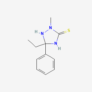 5-ethyl-2-methyl-5-phenyl-1,2,4-triazolidine-3-thione is a heterocyclic compound that belongs to the class of triazolidine derivatives. This compound is characterized by its unique structure, which includes a triazolidine ring with a thione group at the 3-position, and various substituents at the 2, 5, and 5-positions. The presence of these substituents imparts specific chemical and physical properties to the compound, making it of interest in various fields of scientific research.