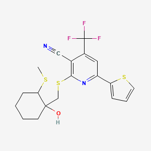 2-[(1-Hydroxy-2-methylsulfanylcyclohexyl)methylsulfanyl]-6-thiophen-2-yl-4-(trifluoromethyl)pyridine-3-carbonitrile is a complex organic compound that features a unique combination of functional groups, including a hydroxyl group, a methylsulfanyl group, a thiophene ring, and a trifluoromethyl group