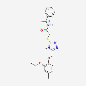 2-({5-[(2-ethoxy-4-methylphenoxy)methyl]-4-methyl-4H-1,2,4-triazol-3-yl}sulfanyl)-N-(1-phenylethyl)acetamide is a complex organic compound that belongs to the class of triazole derivatives. This compound is known for its diverse applications in various fields, including chemistry, biology, medicine, and industry. Its unique structure, which includes a triazole ring, phenoxy group, and thioether linkage, contributes to its distinctive chemical properties and reactivity.