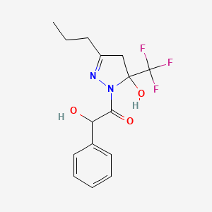 Synthetic Routes and Reaction Conditions: The synthesis of 2-Hydroxy-1-[5-hydroxy-3-propyl-5-(trifluoromethyl)-4,5-dihydro-1H-pyrazol-1-YL]-2-phenylethan-1-one typically involves multi-step organic reactions. One common approach is the condensation of a hydrazine derivative with an appropriate diketone, followed by the introduction of the trifluoromethyl group through a nucleophilic substitution reaction. The final step often involves the hydrolysis of an ester intermediate to yield the desired hydroxy compound.