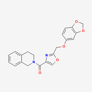[2-(1,3-benzodioxol-5-yloxymethyl)-1,3-oxazol-4-yl]-(3,4-dihydro-1H-isoquinolin-2-yl)methanone is a complex organic compound that features a unique combination of benzodioxole, oxazole, and tetrahydroisoquinoline moieties. This compound is of significant interest in the fields of medicinal chemistry and pharmacology due to its potential biological activities and applications.